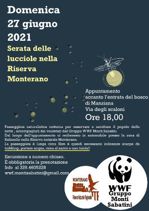 Domenica 27 giugno verrà organizzata una passeggiata naturalistica notturna per osservare e ascoltare il popolo della notte, accompagnati dai volontari del Gruppo WWF Monti Sabatini del WWF Roma e Area Metropolitana. Appuntamento alle ore 18.00 presso l’entrata del Bosco di Manziana in Via degli scaloni. Da qui si andrà in automobile fino alla zona di Rafanello nella Riserva Naturale Regionale Monterano.