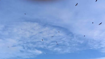 Le cicogne sembravano voler cercare un luogo dove fermarsi, magari per riposarsi un po’ durante il loro viaggio migratorio verso il sud. A un certo punto alcune di loro, sei o sette, si sono posate su un ripetitore telefonico (!) mentre altre optavano per la sommità di alcuni pali di una linea elettrica. Tutto questo nel bel mezzo di una serie infinita di volteggi a spirale, scivolate aeree e voli battuti quasi si trattasse del back stage di uno speciale corpo di ballo mentre esegue le sue prove di danza.