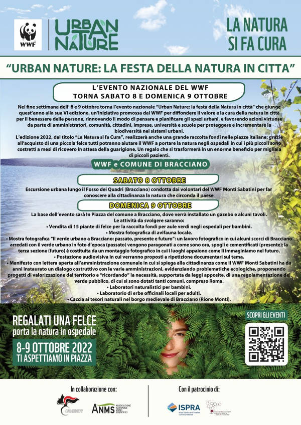 4 ottobre 2022 - WWF URBAN NATURE: a Bracciano 8 e 9 ottobre due giornate tra escursioni, mostre fotografiche e laboratori, con ricerca dei tesori naturali nel borgo medievale (Rione Monti) e stand per la raccolta fondi con le felci per le Oasi Natura negli ospedali pediatrici. Di seguito il programma