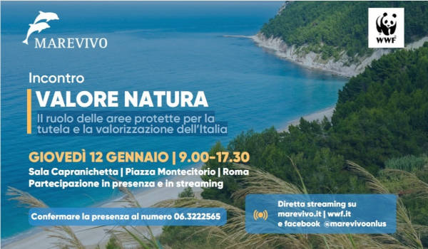 10 gennaio 2023 - Si terrà Giovedì 12 gennaio alle ore 9,30 presso la Sala Capranichetta in Piazza Montecitorio a Roma “VALORE NATURA, LE AREE PROTETTE”, incontro promosso da MAREVIVO E WWF ITALIA sul ruolo delle Aree protette per la tutela e valorizzazione dell'Italia. Insieme ai presidenti di Marevivo e WWF Italia, Rosalba Giugni e Luciano Di Tizio, aprirà i lavori il Ministro dell'Ambiente e della Sicurezza Energetica, Gilberto Pichetto Fratin.