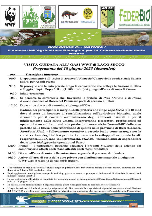 15 giugno 2023 - Biologico è Natura… Il valore dell’agricoltura biologica per la conservazione della Natura. Scopriamolo insieme al WWF nell’Oasi di Lago Secco (Accumoli – Rieti) DOMENICA 18 GIUGNO 2023.