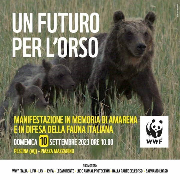 Chi ha cuore la natura del nostro Paese si riunirà per la manifestazione “Un futuro per l’Orso”, in memoria dell’orsa Amarena e in difesa della fauna italiana. E’ stato scelto come luogo simbolico il comune di Pescina in provincia di L’Aquila, un logo fondamentale per l’area degli ultimi 60 orsi bruni marsicani. Qui una intera comunità, al pari della stragrande maggioranza degli abruzzesi, ha vissuto in maniera assolutamente pacifica i frequenti passaggi di Amarena lungo le strade e i vicoli del paese e delle frazioni. Per chi può, è importante partecipare di persona alla manifestazione di domenica con le nostre bandiere. Chi è troppo lontano o è già impegnato può diffondere l’invito e contribuire così a tenere alta l’attenzione sulle nostre richieste. Dichiara il WWF Roma e Area Metropolitana "Un'occasione per ricordare l’Orsa Amarena, un'occasione per ricordare la bellezza che la Natura ci offre, per ricordare le nostre responsabilità verso gli altri non umani, per affermare tutti assieme mai più crimini di Natura."