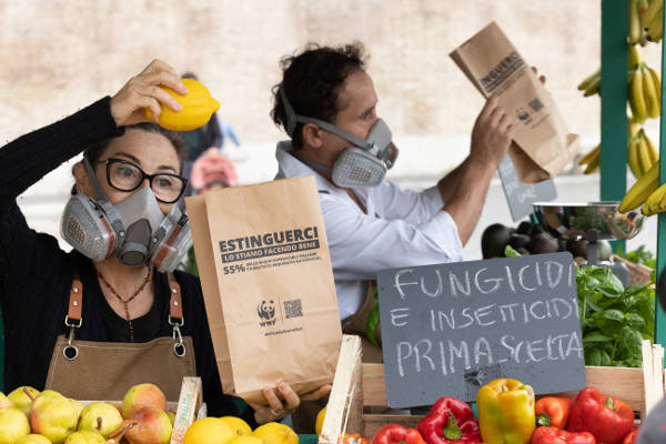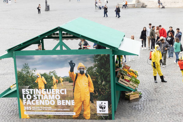 Un chiosco di frutta e verdura è comparso stamattina in Piazza del Popolo a Roma, circondato da un gruppo di “finti” operatori agricoli in tuta gialla impegnati a ricoprirlo di “pesticidi”. È con questa provocazione che il WWF, in occasione della Giornata mondiale dell’Alimentazione (16 ottobre), lancia la sua nuova campagna #IlPandaSiamoNoi con il claim "Estinguerci, lo stiamo facendo bene" accompagnata da uno spot che ha come protagonista una particolare specie da salvare: la specie umana. Invertire la prospettiva da cui siamo abituati a guardare le cose e arrivare alle persone perché siano sempre più consapevoli del valore e dell’impatto che hanno le loro azioni quotidiane. Questo è l’obiettivo della nuova campagna del WWF, che oggi parte proprio dalla denuncia sui pesticidi e il grave impatto che il loro abuso legalizzato sta avendo sulla Natura e sulla nostra salute. Siamo noi la nuova specie a rischio di estinzione: il “panda” siamo noi.