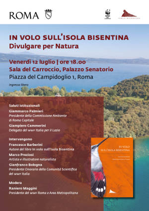 8 luglio 2024 - Venerdì 12 luglio ore 18.00 a Roma presentazione del libro “In volo sull’Isola Bisentina” di Francesco Barberini presso la Sala del Carroccio, Palazzo Senatorio in Piazza del Campidoglio n.1 con i saluti iniziali di Giammarco Palmieri, Presidente della Commissione Ambiente di Roma Capitale - Giampiero Cammerini, Delegato del WWF Italia per il Lazio. Intervengono con Francesco Barberini, autore del libro “In volo sull’Isola Bisentina” Marco Preziosi, artista e illustratore naturalista e Gianfranco Bologna, Presidente Onorario della Comunità Scientifica del WWF Italia. Modera l’incontro Raniero Maggini, Presidente del WWF Roma e Area Metropolitana.
