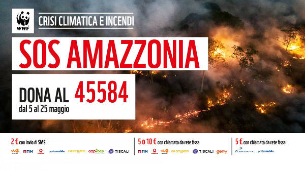 7 maggio 2025 - Un SMS per salvare l’Oasi del Pianeta. Fino al 25 il WWF lancia la campagna SMS solidale “SOS AMAZZONIA BOLIVIANA - EMERGENZA INCENDI” per chiedere l’aiuto di tutti per salvare l’Amazzonia. Questa foresta è considerata l’Oasi del Pianeta poiché tra tutte quelle presenti sulla Terra è quella maggiormente in grado di regolare il clima globale.