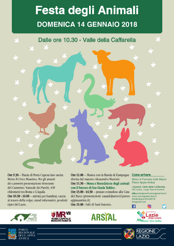 Si svolgerà nel Parco dell’Appia Antica domenica 14 gennaio 2018 a partire dalle ore 10.30 dall’ingresso al Parco di Via Latina – angolo Largo Tacchi Venturi (nella zona della Valle della Caffarella) la ormai tradizionale Festa del Parco che si svolge in occasione della ricorrenza di Sant’Antonio Abate, protettore degli animali domestici e da cortile. Anche quest’anno la Festa presenta un programma ricco come al solito per passare una giornata con i propri amici a 4 zampe e ritrovarsi immersi nell'atmosfera della Campagna Romana.