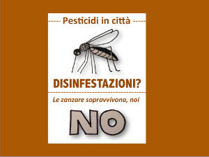 Altre contraddizioni in questa storia sospetta di illegalità (vedi art. 32 della Costituzione che indica la salute come primo diritto umano da difendere) - Non risulta che esistano negli altri Stati Membri attività di disinfestazione antizanzare come da noi. - Varie sostanze tossiche che in Italia vengono vietate in agricoltura e sulle vie di comunicazione, sono invece autorizzate per le disinfestazioni negli ambienti urbani (con precauzioni inesistenti o irrisorie). - In quei giardini pubblici nei quali non si fanno disinfestazioni vi è un numero di gran lunga minore di zanzare. Ciò dipende da quanto già illustrato: la capacità di resistenza ai veleni è in continua e accelerata crescita nelle zanzare (più si disinfesta e più si riproducono). - Un’altra questione ben grave mai presa in considerazione è che gli insetticidi riducono drasticamente le popolazioni dei predatori naturali delle zanzare (pipistrelli, gechi, libellule, uccelli insettivori, altri insetti, ecc.), con il paradossale risultato di una popolazione sempre più abbondante proprio di quell’insetto, la zanzara, che si vuole contrastare. - Le disinfestazioni distruggono malauguratamente anche i pochi esempi di biodiversità residua nei nostri centri abitati, sterminando piccoli mammiferi, rettili, anfibi, pesci, altri insetti, ecc., ed annientano animali fondamentali come le api, importantissime per il loro ruolo di impollinazione. Cosa fare dunque? La proliferazione eventuale delle zanzare e in particolare della zanzara tigre può essere efficacemente contrastata solo con la prevenzione e l’intervento sui focolai larvali, con metodi ecologici ed alternativi integrati. Alla zanzara basta una piccola raccolta d’acqua per deporre le uova ed è evidente che quando centinaia di uova o larve di zanzara sono concentrate in un unico luogo è più facile combatterle che non da adulte, quando si disperdono in ambienti aperti. La cosa più importante è dunque fornire ai cittadini una corretta informazione su quanto qui denunciato e su come devono essere effettuate le disinfestazioni “biologiche“ esistenti, che sono efficaci e non dannose ad altri. Esistono attualmente diversi sistemi di lotta, tutti integrabili gli uni con gli altri. Le istituzioni dovranno fare rete con i cittadini, coinvolgendoli attivamente e responsabilmente.