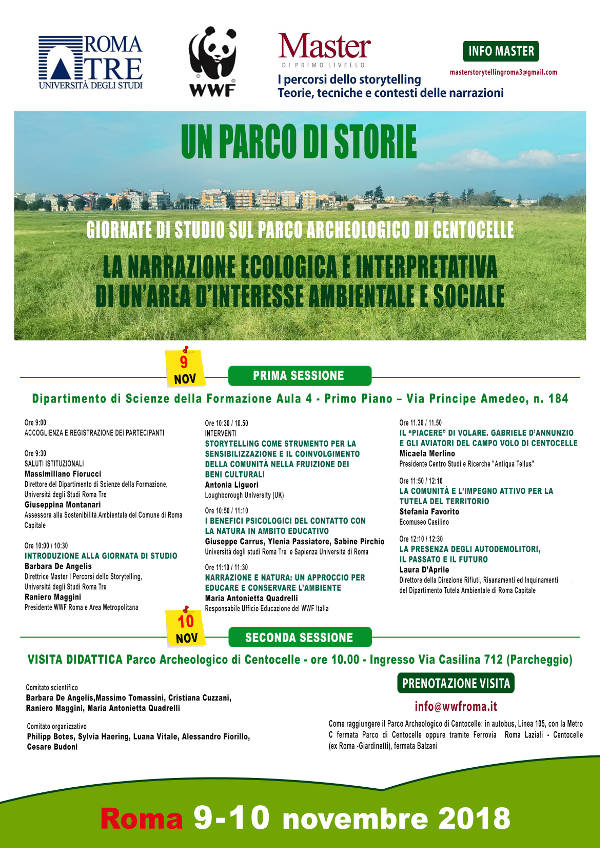 In continuità con lo scorso anno, per il 2018 si rinnova la collaborazione tra l'Università di Roma Tre e il WWF Roma e Area Metropolitana, nell'ambito del corso di Master "Stoytelling, contesti e tecniche di narrazione". Anche quest'anno, sempre in coerenza con le priorità seguite dall'Associazione, l’iniziativa si svilupperà su due giornate: il convegno venerdì 9 novembre e visita didattica sabato 10 novembre. L'iniziativa dei due giorni avrà come titolo: “UN PARCO DI STORIE - Giornate di studio sul Parco archeologico di Centocelle. La narrazione ecologica e interpretativa di un’area d’interesse ambientale e sociale”. L'obiettivo è raccontare questa area attraverso letture diverse, la ricchezza, i valori, oltre le emergenze di cronaca, coniugando a varie testimonianze i contributi di natura più tecnica del mondo accademico. La prima edizione del 2017 aveva visto l'adozione di un caso studio legato ad un'area da sempre oggetto d'attenzione da parte del WWF lungo il Tevere all'interno del contesto urbano. Di seguito il programma completo.