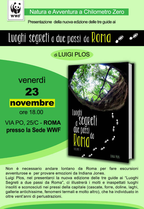 Non è necessario andare lontano da Roma per fare escursioni avventurose e per provare emozioni da Indiana Jones. Luigi Plos, nel presentarci la nuova edizione delle tre guide ai “Luoghi Segreti a due passi da Roma”, ci illustrerà i molti e inaspettati luoghi insoliti e sconosciuti nei pressi della capitale (cascate, forre, doline, laghi, gallerie antichissime, fenomeni termali e molto altro), che ha individuato in oltre vent’anni di perlustrazioni. Un modo nuovo di vivere la natura e di conoscere, e valorizzare, il territorio unico al mondo che circonda la capitale.