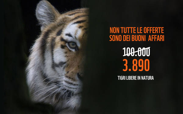 “La natura non fa sconti”. È questa la campagna provocatoria che il WWF Italia ha deciso di lanciare in occasione del Black Friday. Infatti il “saldo” negativo fatto registrare dalle popolazioni di alcune specie le sta avvicinando pericolosamente all’estinzione. L’associazione del Panda ha, infatti, fatto una rapida ricognizione delle specie più a rischio indicando le percentuali di declino. In natura restano oggi meno di 3.900 tigri (Panthera tigris). Nell’ultimo secolo abbiamo perso circa il 97% della popolazione originaria, a causa del bracconaggio e della distruzione della foresta dove vive. Negli ultimi anni però si assiste ad un segnale di speranza: per la prima volta nell’ultimo secolo, infatti, la popolazione di tigre ha un trend positivo, con una popolazione che è passata dai 3.200 individui stimati nel 2010, ai 3.890 attuali.