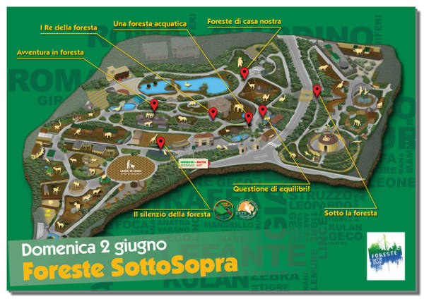 Inoltre, le attività evidenzieranno le caratteristiche più salienti delle specie animali che abitano nelle foreste - tra cui tigri, elefanti, leoni astici nonché molte specie di primate e di uccelli - i loro particolari adattamenti e le principali cause che ne minacciano l’esistenza tra cui la deforestazione. Le stesse foreste sono sottosopra, a soqquadro, a causa della forte pressione antropica e si stima che ogni due minuti venga distrutta un’area pari a un campo di calcio. Foreste sottosopra è una campagna ideata dal gruppo di lavoro EDUZOO, gli educatori della UIZA che nasce dall’esigenza di informare e sensibilizzare il pubblico sul tema delle foreste, sia terrestri sia acquatiche, anche in adesione alla campagna “Silent Forest” promossa per il 2018 dall’EAZA, l’Unione Europea Zoo e Acquari, contro il bracconaggio con particolare riferimento alle specie canore https://www.silentforest.eu/ L'iniziativa è parte del programma di “EUREKA! Roma 2018” promosso da Roma Capitale Assessorato alla Crescita culturale.