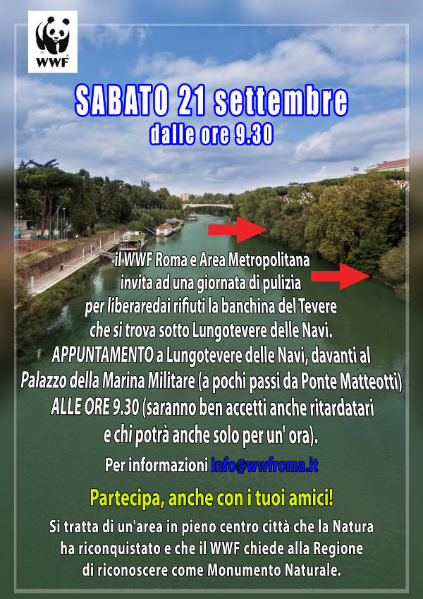 SABATO 21/09 a partire dalle ORE 9.30 il WWF Roma e Area Metropolitana invita ad una giornata di pulizia per liberare dai rifiuti la banchina del Tevere che si trova sotto Lungotevere delle Navi.