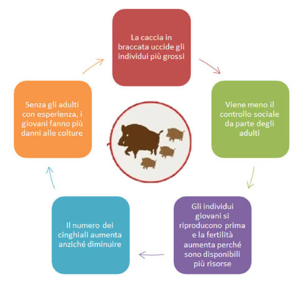 A questo si somma il vantaggio legato alle molte vendite illegali delle carni (che può raggiungere un giro di affari di milioni di euro ogni anno), grazie alla disponibilità di ristoratori compiacenti e alla scarsità di controlli sanitari e fiscali. È quindi evidente che il mondo venatorio non ha alcun interesse a ridurre la presenza di ungulati sul territorio, perché ne trae divertimento ed utilità. Anzi, la stessa caccia esercitata in modalità non selettiva, come nella braccata, può far addirittura aumentare le popolazioni di cinghiali, rimuovendo gli individui di maggiori dimensioni (gli adulti) con la conseguente riproduzione anticipata degli individui più giovani, che in presenza degli adulti non si riprodurrebbero. Al secondo posto vengono i metodi ecologici, ovvero quelle modalità di prevenzione e gestione del territorio che riducono la possibilità di accesso della fauna alle coltivazioni, come recinzioni elettrificate da installare nei periodi di maggiore vulnerabilità della colture, in particolare dopo la semina, la comparsa dei germogli o dei frutti maturi.