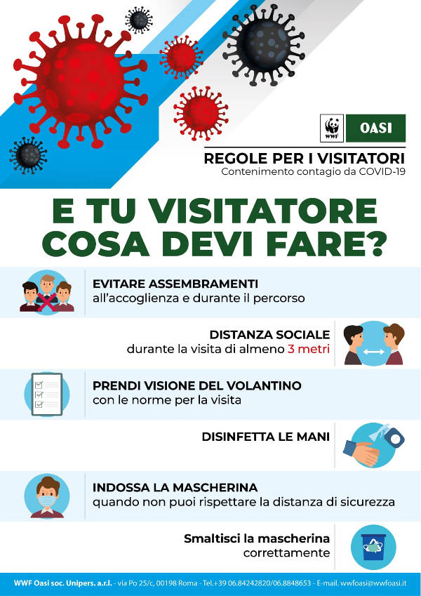 La riapertura delle Oasi e delle Riserve del WWF è regolata da un Protocollo sottoscritto dal Medico Competente e dal Responsabile del Servizio di Prevenzione e Protezione di WWF Italia e WWF Oasi, che stabilisce le indicazioni operative atte a prevenire il contagio da COVID-19.