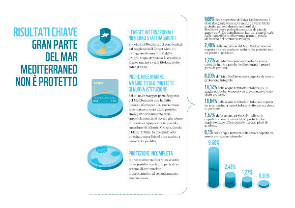 Abbiamo bisogno di cambiamenti coraggiosi se vogliamo dare alle giovani generazioni la possibilità di vivere e lavorare nel Mediterraneo". Nel Mediterraneo purtroppo i servizi ecosistemici sono a forte rischio: il 33% degli habitat marini italiani di interesse comunitario, tra cui praterie di posidonia, foreste di macroalghe e coralligene, presentano uno stato di conservazione inadeguato. Questo a causa delle elevate pressioni cui sono soggetti mari e coste Italiani: nel 2015 l’Italia era al terzo posto in Europa per volume di traffico merci via mare e al primo per numero di passeggeri, la prima destinazione crocieristica d’Europa, con 700 porti, una flotta di pesca tra le più grandi in Europa e un settore di acquacoltura in fortissima espansione.