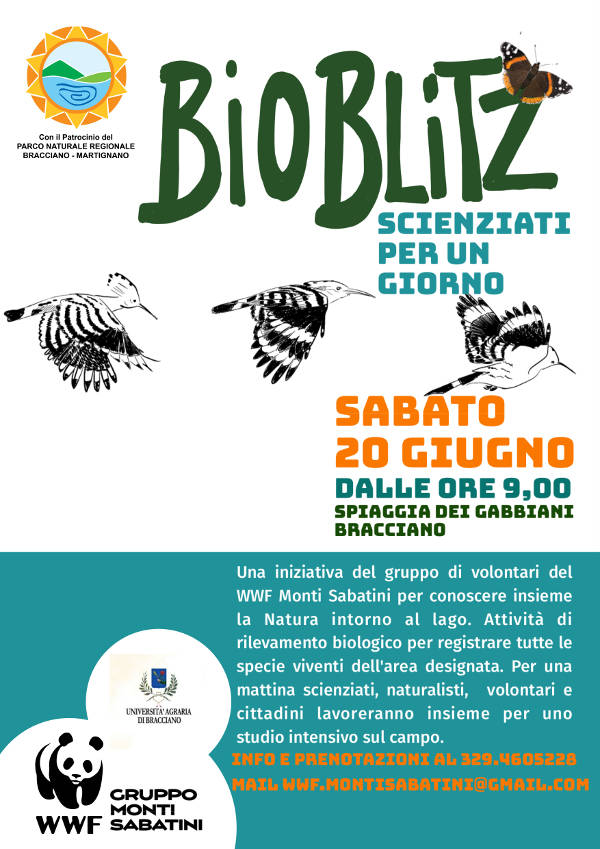 Sabato 20 giugno a partire dalle ore 9.00 iniziativa del WWF Monti Sabatini “Bioblitz: scienziati per un giorno” presso la Spiaggia dei Gabbiani a Bracciano con il patrocinio del Parco Naturale Regionale Bracciano-Martignano e la collaborazione della Università agraria di Bracciano. Prenotarsi alla mail Questo indirizzo email è protetto dagli spambots. È necessario abilitare JavaScript per vederlo.