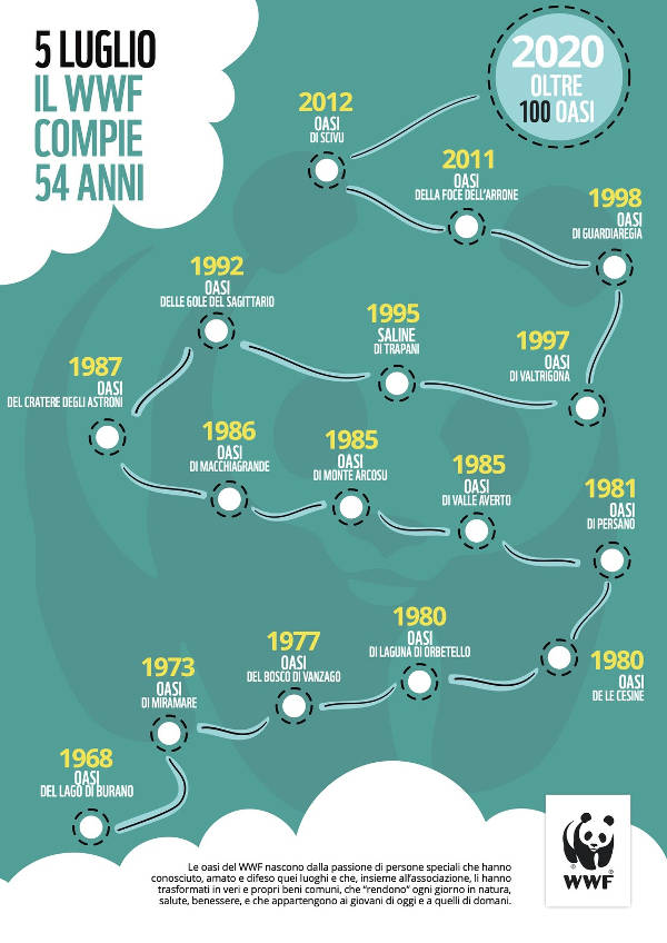Il 5 luglio è il compleanno del WWF. L’associazione, fondata in Italia nel 1966 da Fulco Pratesi e altri pionieri compie 54 anni, tutti spesi per difendere e promuovere il capitale naturale italiano. Con le sue Oasi, che oggi sono più di 100, il WWF in Italia è riuscito a salvare habitat e specie straordinari che rischiavano di scomparire per sempre.