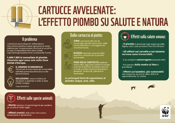 L’inquinamento da piombo legato all’attività della caccia è un problema serio e poco conosciuto, un avvelenamento silenzioso che minaccia gravemente la biodiversità e la nostra salute. Ogni anno le munizioni disperdono nell’ambiente miliardi di pallini di piombo che causano la morte indiretta di milioni di uccelli in tutto il mondo (un milione solo nelle zone umide Europee), inquinando gli ecosistemi e minacciando la salute umana. Il WWF lancia l’allarme nel suo report “Cartucce avvelenate” nel quale si ribadisce come il piombo sia un metallo altamente tossico, tanto da essere stato bandito da tutti i prodotti di consumo come benzina, vernici, tubature.