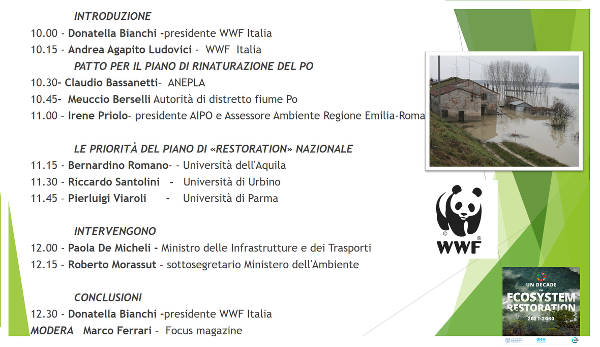 Il documento verrà presentato nel corso dell’incontro, alla presenza di Paola De Micheli, Ministro delle Infrastrutture e dei Trasporti; Roberto Morassut, Sottosegretario al ministero dell’Ambiente; Donatella Bianchi, Presidente WWF Italia; Andrea Agapito Ludovici, Responsabile Acque del WWF Italia; Claudio Bassanetti (Presidente ANEPLA, Associazione Nazionale Estrattori Produttori Lapidei Affini) ), Meuccio Berselli (Segretario Generale Autorità di Bacino Fiume Po), Irene Priolo (Presidente AIPO - Agenzia Interregionale per il Po) e i docenti Bernardino Romano, Riccardo Santolini e Pierluigi Viaroli. Il Piano nazionale Restoration proposto dal WWF indica le priorità d’azione, la programmazione e la quantificazione delle risorse economiche e finanziarie necessarie alla sua concreta realizzazione e l’individuazione degli strumenti normativi, tecnici e finanziari più adeguati per garantire l’avvio di un’efficacie azione di rinaturazione nel nostro Paese. Per questo il WWF ha individuato 6 aree vaste prioritarie per la riconnessione ecologica e l’adattamento ai cambiamenti climatici (le Alpi, il Corridoio Alpi Appennino, la valle del Po, l’Appennino umbro-marchigiano, l’Appennino campano centrale, la Valle del Crati - Presila Cosentina), dove avviare interventi di ripristino ambientale e per la continuità ecologica, fermando la progressiva perdita di biodiversità che costituisce uno dei patrimoni più importanti del nostro Paese. Per una di queste aree, quella che riguarda il più grande fiume d’Italia, il Po, il WWF ha elaborato una proposta di Piano di rinaturazione che potrebbe già diventare operativo a breve e che verrà presentato nel corso dell’incontro. Appuntamento il 17 novembre alle 10 su facebook.com/wwfitalia