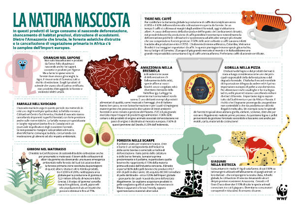 C’è tanta, troppa natura sacrificata in molti prodotti di largo consumo, alcuni dei quali tipicamente italiani, come il caffè: l’80% della deforestazione mondiale è, infatti, è dovuta alla necessità di fare posto ai pascoli per la produzione di carne, alle piantagioni di soia e olio di palma richiesti dai Paesi occidentali che consumano e sprecano sempre di più. I consumi dell’Europa sono responsabili del 10% della deforestazione globale, che avviene prevalentemente al di fuori dei confini dell’UE, e il nostro Paese ha un’alta responsabilità visto che siamo un tradizionale importatore di materie prime provenienti dalle foreste: non solo legname, ma anche carni, soia, olio di palma, caffè, cacao, cuoio, e altro ancora, tutti prodotti ad alto ‘contenuto’ di deforestazione.