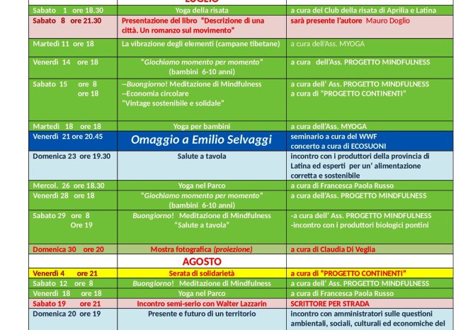 Temi fondamentali saranno il benessere nella natura, l’arricchimento culturale tramite la conoscenza di nuovi autori e la sostenibilità ambientale nell’ambito particolare dell’alimentazione. Nella tabella che segue potrete prendere nota del programma in svolgimento anche per il mese di agosto.