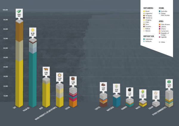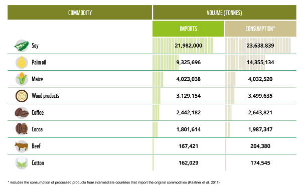 Secondo il rapporto WWF, nel 2017 l’Unione Europea è risultata il secondo più grande importatore di deforestazione incorporata nei prodotti, subito dopo la Cina. La sua responsabilità è infatti ricollegabile alla deforestazione e trasformazione di 203.000 ettari di terreni naturali, con l’emissione di 116 milioni di tonnellate di CO₂. Nel periodo di studio l'UE ha causato il 16% della deforestazione associata al commercio internazionale, superando India (9%), Stati Uniti (7%) e Giappone (5%) [1]. Tra il 2005-2017 la soia, l’olio di palma e la carne bovina sono stati, in termini quantitativi, i prodotti importati dall’UE di maggior peso nella deforestazione tropicale, seguiti dai prodotti legnosi prelevati da piantagioni, cacao e caffè. Durante questo periodo otto tra le maggiori economie dell’UE (nell’ordine: Germania, Italia, Spagna, Regno Unito, Paesi Bassi, Francia, Belgio e Polonia) hanno generato, da sole, l’80% della deforestazione collegata alle importazioni UE dai paesi tropicali. Nel grafico sopra la stima della deforestazione tropicale inclusa nei prodotti importati (usati e consumati) tra il 2005 e il 2017 nell'UE28 per singolo Stato. Deforestazione media annuale (periodo 2005-2017) in ettari (barre rosse) e deforestazione pro capite media annuale in metri quadrati (barre beige). La domanda di questi prodotti da parte dell'UE è anche alla base della distruzione di ecosistemi non forestali, come le praterie o le zone umide. Il report del WWF mostra chiari legami tra i consumi dei paesi dell'UE, in particolare di soia e manzo, e la conversione delle praterie in terreni agricoli, come ad esempio gli hotspot di deforestazione del Cerrado in Brasile e del Chaco in Argentina e Paraguay [2].
