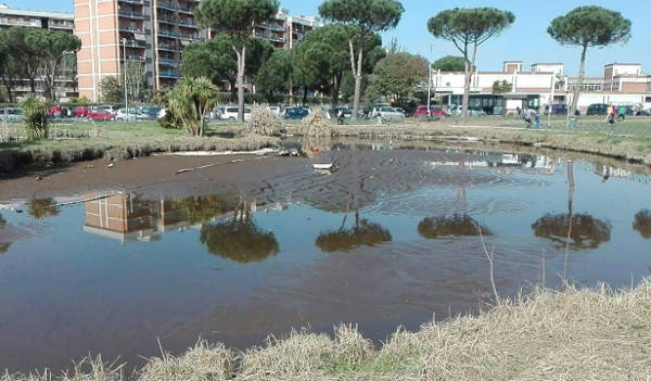 Questo piccolo specchio d’acqua, posto in posizione strategica considerando la limitrofa ed estesa (ma purtroppo anch’essa minacciata, in questo caso dal cemento) area verde della Tenuta della Mistica/Casa Calda, versa da tempo e periodicamente in condizioni critiche. Ciò accade a volte per guasti o rotture delle pompe di alimentazione e anche a causa della perdita di impermeabilizzazione del fondo, che provoca frequenti e sempre più ravvicinati prosciugamenti dello specchio d’acqua con conseguente moria degli animali che lo popolano (anche diverse specie di pesci e tartarughe).