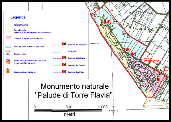 L’area umida protetta Monumento naturale “Palude di Torre Flavia” è situata lungo il litorale tirrenico a nord di Roma, nei comuni di Ladispoli e Cerveteri (Provincia di Roma; coordinate geografiche: 41° 58’ N; 12° 03’E). L’area, estesa su circa 40 ha, si sviluppa parallelamente alla linea di costa in direzione Nord-Ovest/Sud-Est per una lunghezza di ca. 1500 m, una profondità massima verso l’entroterra di ca. 500 m e una altitudine compresa tra 0 e 3 m s.l.m. Il Monumento Naturale Palude di Torre Flavia rappresenta una delle ultime aree palustri del litorale laziale, importante habitat naturale per l’avifauna migratoria. Dagli anni ’70 del secolo scorso l’area è stata progressivamente bonificata e attualmente si sviluppa su terreni argilloso-limosi, ricchi di materiale organico di origine vegetale che consente l’accumulo di acque nella porzione retrodunale. Lembi residuali di un’antica duna sabbiosa separano la Palude dal mare. I venti dominanti sono quelli provenienti dal mare; nei mesi autunnali prevalgono quelli di nord-ovest, mentre in estate prevalgono i venti caldi del quadrante occidentale e meridionale che accentuano gli effetti sulla vegetazione della già marcata evapotraspirazione.